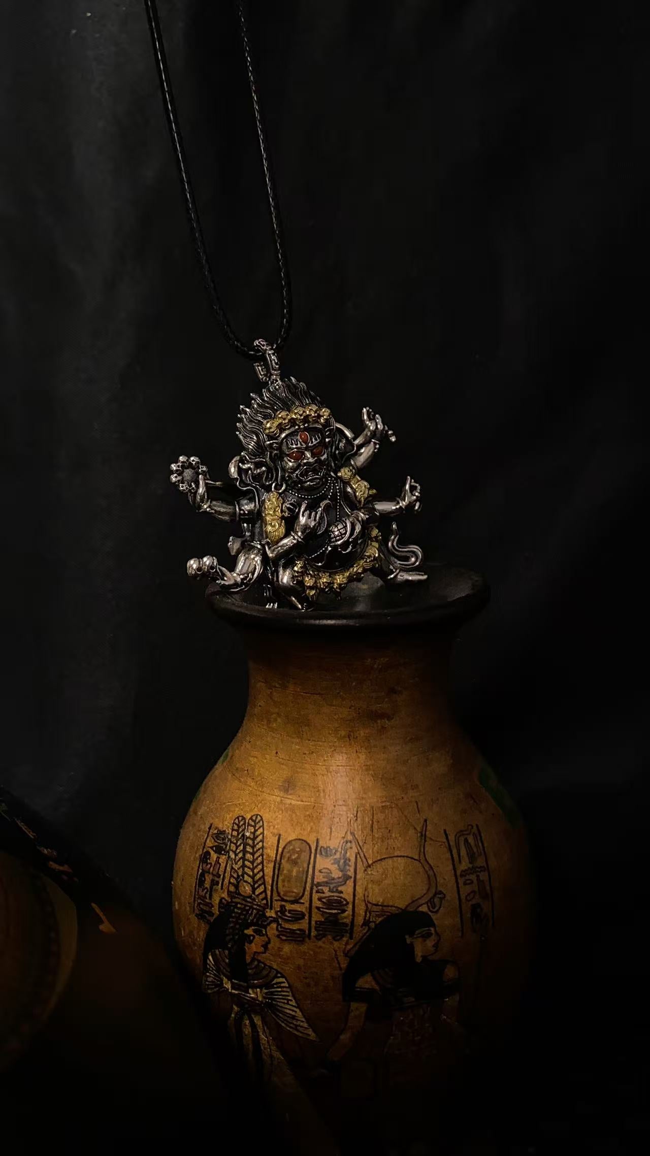 Six-Armed Mahakala Sterling Silver Pendant - Inlaid with Natural Red Agate